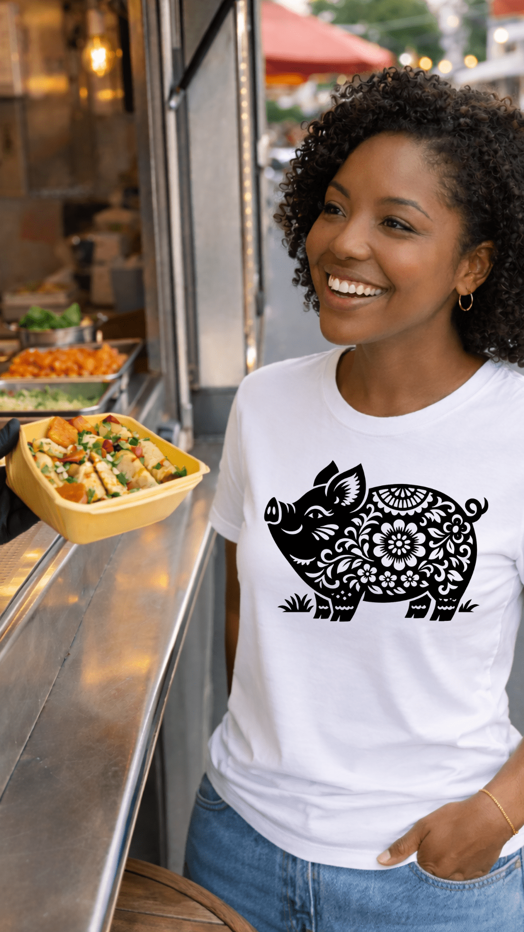 This lightweight cotton tee feels both nostalgic and spirited. Wear it on slow weekend mornings, at local craft fairs, or layered under a denim jacket for a stroll through town. The soft ring-spun cotton drapes gently, letting the detailed black-and-white motif stand out while keeping you comfortable all day. It’s for people who appreciate handcrafted patterns, quiet charm, and clothing that feels lived-in from the first wear.